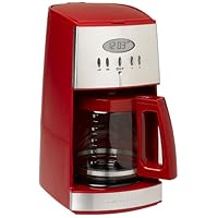 With its sleek contemporary styling, this 12-cup coffeemaker not only looks good on the kitchen counter, but it also provides an array of convenient features. The machine's user-friendly control panel and digital display ensure ease of use, while its programmable clock/timer function allows for waking up to the aroma of freshly brewed coffee. A glass carafe comes included, complete with a stay-cool handle, measuring marks up the side, and a drip-free pour spout. For sneaking a quick cup of coffee midbrew, simply remove the carafe from the machine to pause the flow of coffee, then replace the carafe to continue the brewing process--a nice feature, particularly for those in a hurry for that first sip. Other highlights include a nonstick hot plate, two-hour automatic shut-off for safety and peace of mind, cord storage, and easy-to-clean removable parts. The matching Ensemble toaster, can opener, and blender can be purchased separately for a coordinated look. In bold red with stainless-steel accents, the coffeemaker measures approximately 11 by 8 by 14 inches and carries a one-year limited warranty.
