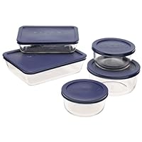 Pyrex Storage 10-piece set with lids includes 1-each 3-1/2-cup rectangular dish with dark blue plastic cover, 1-each 6-cup rectangular dish with dark blue plastic cover, 1-each 4-cup round dish with dark blue plastic cover, and 2-each 2-cup round dishes with dark blue plastic covers. Pyrex Storage products come with seal tight plastic lids for secure food storage. They are designed for reheating leftovers and convenient refrigerator storage. The durability of Pyrex Storage allows stacking for efficient space utilization.There's no substitute for Pyrex, the original glass bakeware. Introduced 90 years ago and made of a durable, high temperature material, Pyrex remains the ideal medium for safe, dependable food preparation.