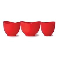 Set of 3 mixing bowls in a new modern material offers up exciting new function in your kitchen.Flexible rim forms spout anywhere when sides are squeezed for pouring directly into a narrow space like the bowl of a stand mixer or a food processor.Also great for drizzling liquids in a smooth steady stream.Other features include:rigid bottoms for stability and leverage while mixing, bowls are microwave and dishwasher safe, bowls are heat resistant up to 490 degrees, the outside of the bowl is textured for a secure grip, while the inside is smooth for easy pouring, material also grips counter to provide traction. .Bowls are available in three sizes to suit all your mixing needs.Available in three colors: Red, White and Wasabi
